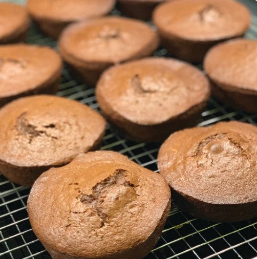 Harina de almendra, proteína de chocolate vegana, huevo, cacao en polvo, agua, ghee, trigo (15%), chispas de cacao y stevia.